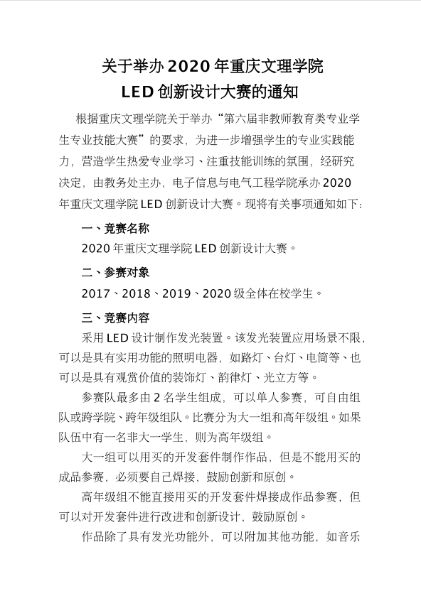 关于举办2020年重庆文理学院LED创新设计大赛的通知