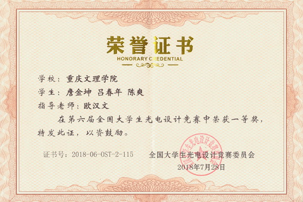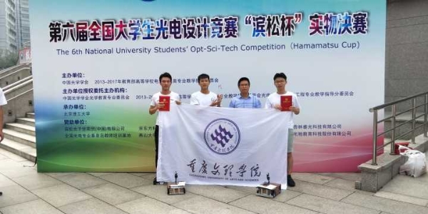 7月26日至28日,第六届全国大学生光电设计竞赛在北京理工大学中关村校区举行。我校学子在大赛上表现突出,成绩优异,由电子电气工程学院教师欧汉文指导,詹金坤、吕春年、陈爽3位同学组成的“智电科技队”在竞技车组比赛中荣获一等奖,欧汉文老师荣获优秀指导老师奖。此外,由新材料技术研究院刘代军、孙凌涛老师指导,我院徐静、娄金灿、周后波3位同学组成的团队在竞技车组比赛中荣获二等奖。此奖参赛荣获佳绩,是学校和学院对学生专业技能竞赛高度重视、指导教师悉心指导和全体参赛同学努力拼搏的结果。