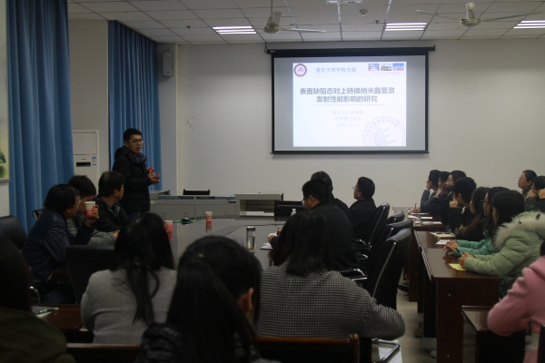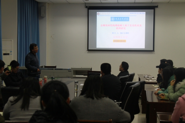随后,来访的徐旭辉教授和杨正文教授分别作了题为“缺陷态对上转换纳米晶激光性能影响的研究”、“金属纳米结构增强稀土离子发光性质研究”的学术报告。报告开拓了师生的视野,鼓励学生认真学习专业知识和新技术,激发了学生对科学研究的热情,对学生今后的学习和科研起到了很好的指导作用。